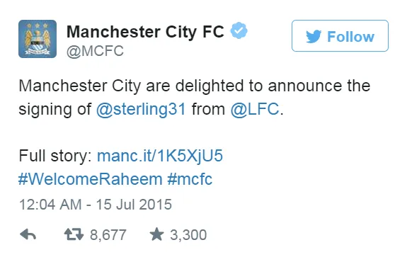 The club went on Twitter to announce the transfer, making Sterling the most expensive English footballer in history.