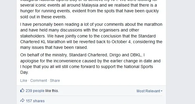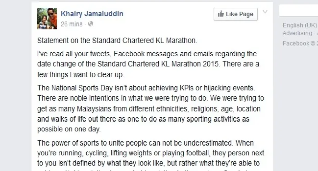 A statement on his Facebook page read: “Statement on the Standard Chartered KL Marathon.” The Statement began,