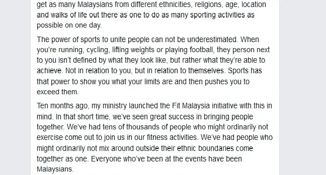 “The National Sports Day is not a political event with a political agenda, like how Teachers Day or Cancer Awareness Month are not. It was to be our step towards becoming a sporting nation and to make sports and fitness part of a Malaysian culture, identity and lifestyle. We are a sports-loving nation but we are nowhere near being a sporting nation.
