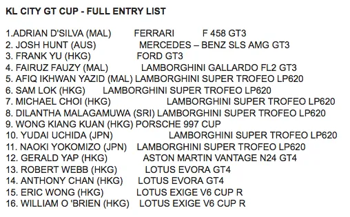 Three Malaysians, two Japanese, one each from Australia and Sri Lanka and nine drivers from Hong Kong will be vying for the glamourous privilege of being the first champion of the inaugural Kuala Lumpur’s first ever street race – the KL City GT Cup this weekend.