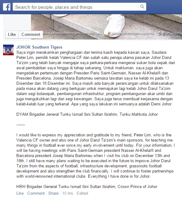 According to the JOHOR Southern Tigers official Facebook page, Tunku Ismail is looking forward to expand his partnership with Spanish treble winners Barcelona and French big-spenders Paris Saint-Germain!