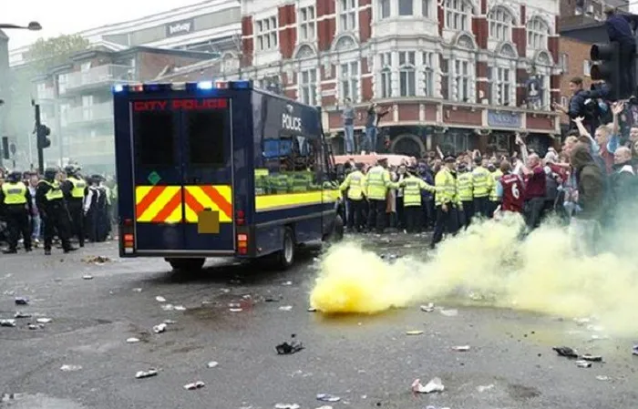 The Hammers fans threw eggs, glass bottles and tin cans at the bus, which broke the tint on the windows. They continued to light up flares on the streets regardless of the police.