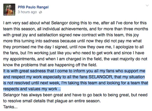 Rangel, who was the Super League top scorer this year, claimed that the Selangor FA management are not appreciative of his contributions to the team and it was unfair of them to not deliver their promise. He also went on to apologize to the fans for the statement, though he added that the majority out there aren’t aware of what happens off the pitch.