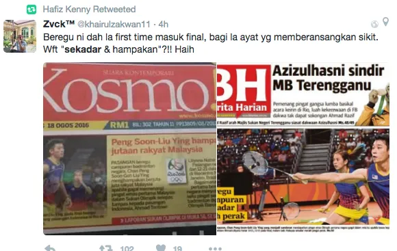 Namun, rakyat Malaysia dikejutkan dengan headline dari media tempatan yang bagi mereka dilihat merendahkan pencapaian bergu negara itu. Cukup membanggakan apabila rakyat Malaysia bersatu mempertahan kejayaan pasangan negara merangkul pingat perak Olimpik itu.
