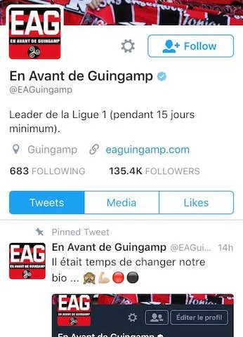EA Guingamp berjaya menduduki tangga pertama Ligue 1 selepas menewaskan Nancy 2-0 dalam perlawanan pada hari Ahad lalu. Mungkinkah Guingamp akan mencipta sejarah seperti Leicester City dalam Liga Perdana Inggeris tahun lalu? Pasti menarik untuk melihat apa profil twitter mereka jika mereka bergelar juara Ligue 1.