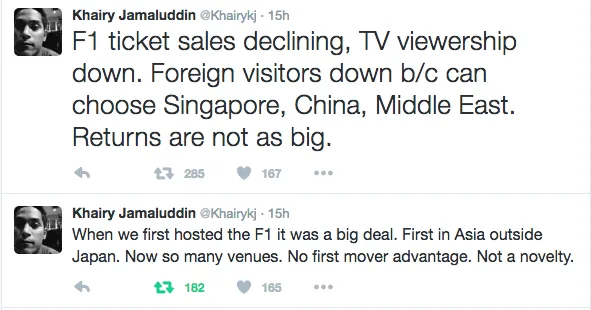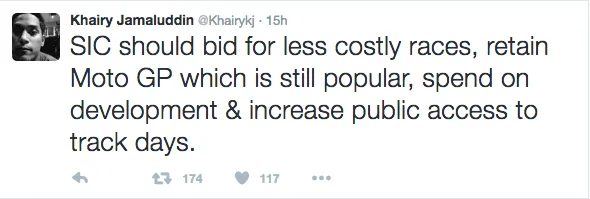 “Saya rasa kita perlu berhenti anjurkan F1. Sekurang-kurangnya buat sementara waktu, Kos tinggi, pulangan terhad,” tulis Khairy di twitter beliau.