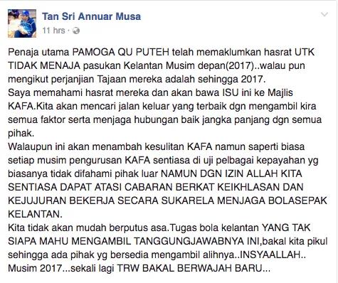 Menerusi laman Facebook rasminya, Tan Sri Annuar Musa menyatakan bahawa: “Penaja utama PAMOGA QU PUTEH telah memaklumkan hasrat untuk tidak menaja pasukan Kelantan musim depan (2017) walaupun mengikut perjanjian, tajaan mereka adalah sehingga 2017.”