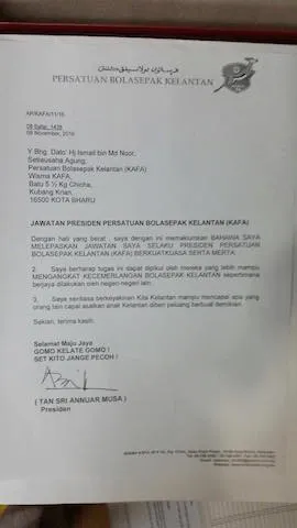 “Saya berharap tugas ini dapat dipikul oleh mereka yang lebih mampu mengangkat kecemerlangan bolasepak Kelantan sepertimana berjaya dilakukan oleh negeri-negeri lain,” ujar beliau dalam surat tersebut.