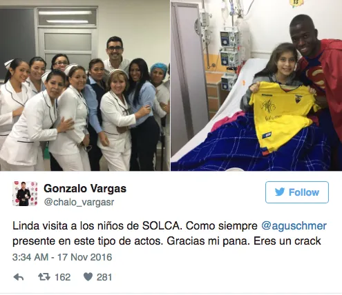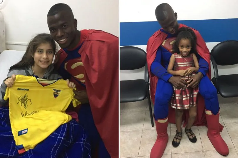 Enner Valencia membuat lawatan ke sebuah hospital di Ecuador untuk melawat kanak-kanak yang sakit berpakaian seperti Superman.