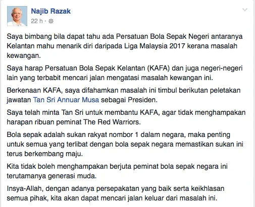 The PM took to both Facebook and Twitter to convey his concern and hopes that the Kelantan Football Association (KAFA) and other states involved will “find a way” to solve their financial troubles.