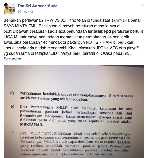 Dalam status yang dimuatnaik di laman Facebooknya, Annuar Musa meminta FMLLP menjelaskan mengapa perlawanan tersebut ditunda di saat akhir peraturan hanya membenarkan penundaan perlawanan dilakukan di antara 7-14 hari sebelum perlawanan.