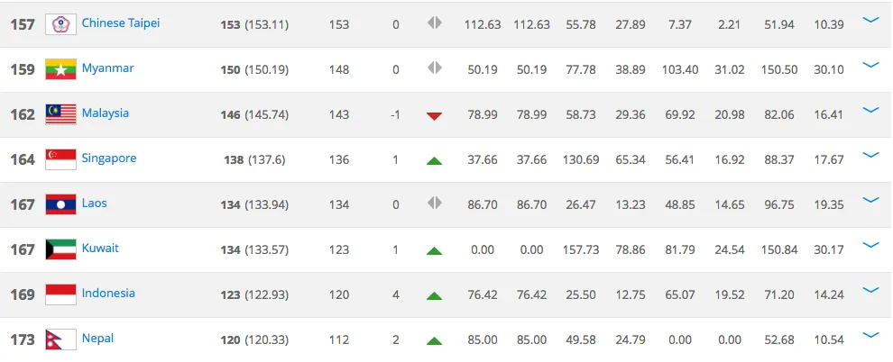 Sementara itu, Vietnam kekal di tangga ke 136, Myanmar (159), Singapura (164), Laos (167), Indonesia naik empat tempat ke kedudukan 169 dunia, Kemboja (175), Brunei ( 184) dan Timor Leste (194).