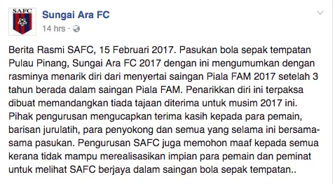 Tidak sampai lima hari lagi, sepak mula Piala FAM 2017 akan bermula, pasukan kelab dari Pulau Pinang, Sungai Ara FC mengumumkan penarikan diri mereka.