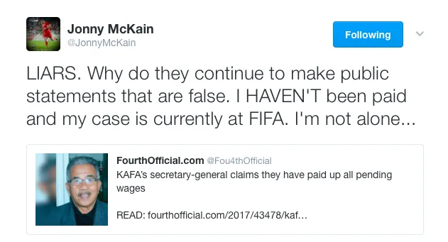 “LIARS. Why do they continue to make public statements that are false. I HAVEN’T been paid and my case is currently at FIFA. I’m not alone…” McKain posted on Twitter, quoting the news by FourthOfficial.com