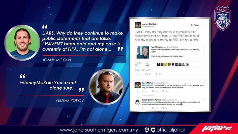 On the Johor Southern Tigers Facebook page, JDT posted a screenshot of former Kelantan import Jonathan McKain’s rebuttal tweet to a news claiming that Kelantan FA (KAFA) has paid up all the pending wages.