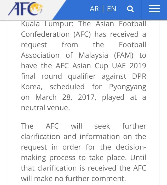 “The Asian Football Confederation (AFC) has received a request from the Football Association of Malaysia (FAM) to have the AFC Asian Cup UAE 2019 final round qualifier against DPR Korea, scheduled for Pyongyang on March 28, 2017, played at a neutral venue.” the statement read.