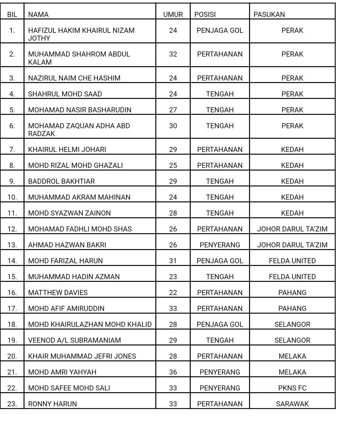 Datuk Ong Kim Swee’s filled in the missing pieces with new names Mohd Afif Amiruddin from Pahang, Khair Muhammad Jefri Jones from Melaka, Mohamad Nasir Basharudin from Perak, and Muhammad Akram Mahinan from Kedah.