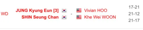 Malaysian duo Vivian Hoo-Woon Khe Wei were on to a promising start as they dominated the first round 17-21. However, they failed to keep that momentum going as Korea’s Jung Kyung Eun and Shin Seung Chan retaliated and defeated them in the next two rounds.