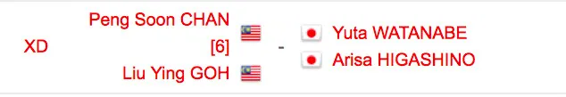 Mixed doubles: Chan Peng Soon-Goh Liu Ying v Yuta Watanabe-Arisa Higashino