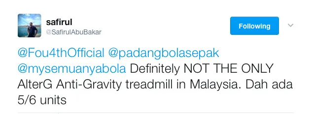 [UPDATE] National Football Development Programme Malaysia’s CEO Safirul Abu Bakar has pointed out that aside from Johor DT, the anti-gravity treadmills are also being used in Penang, KPJ Ara Damansara, as well as the National Sports Institute (ISN).