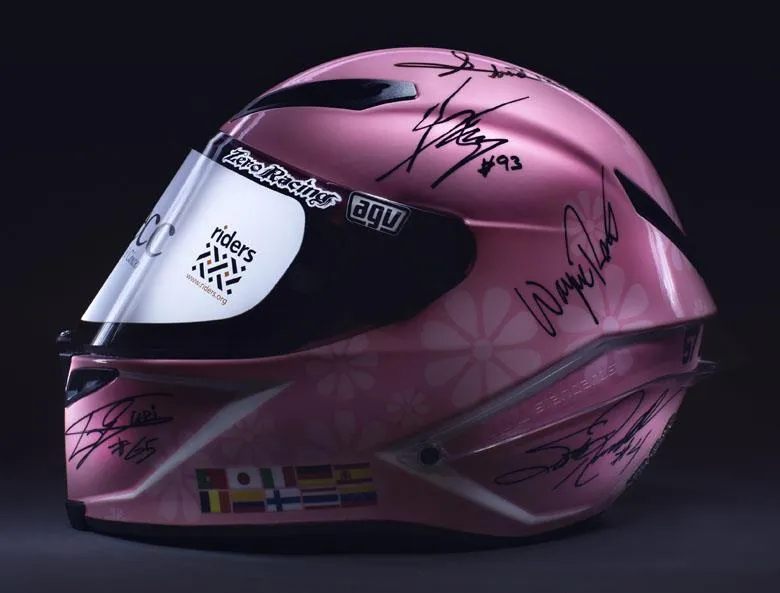 Proceeds from the helmet, which is signed by the likes of Giacomo Agostini, Angel Nieto, Valentino Rossi, Jorge Lorenzo, Marc Márquez, Dani Pedrosa, Wayne Rainey, Loris Capirossi, Àlex Crivillé, Wayne Gardner, Scott Russell and Randy Mamola, will be donated entirely to charity.