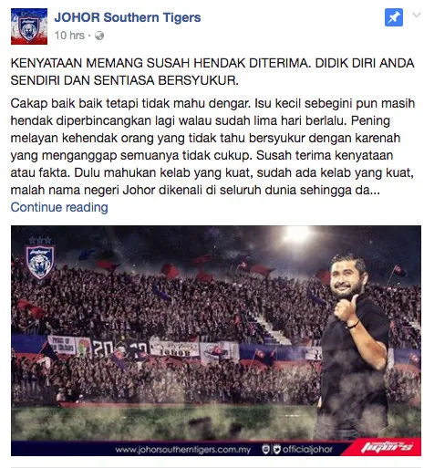 Dalam satu kenyataan di laman Facebook Johor Southern Tigers, Tunku Ismail Ibni Sultan Ibrahim, atau lebih dikenali sebagai TMJ menegur sebilangan penyokong Johor yang berselisih faham sesam sendiri.