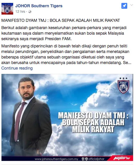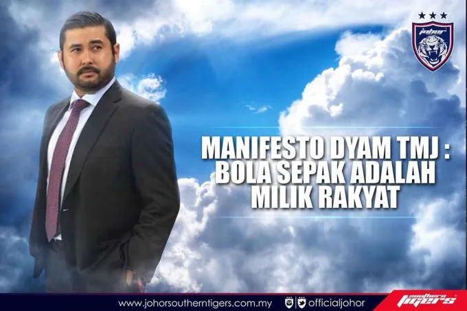 Menjelang pemilihan FAM pada 25 Mac ini, TMJ telah membentangkan manifesto beliau dengan mengutamakan tema ‘Bolasepak Adalah Milik Rakyat’ menerusi laman Facebook Johor Southern Tigers pada hari Isnin.