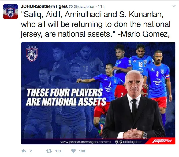 The photo had four JDT players who have “retired” from the national football team, namely Aidil Zafuan Abd. Radzak, Safiq Rahim, S. Kunanlan dan Mohd. Amirulhadi Zainal, with the caption “Welcome back”.