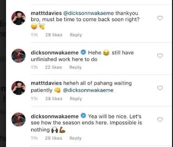 Ini bukanlah satu berita yang sahih tetapi jika dilihat pada perbualan di antara Dickson dan Matt Davies di laman instagram milik Matt Davies, pastinya akan timbul satu sinar harapan untuk penyokong Pahang.