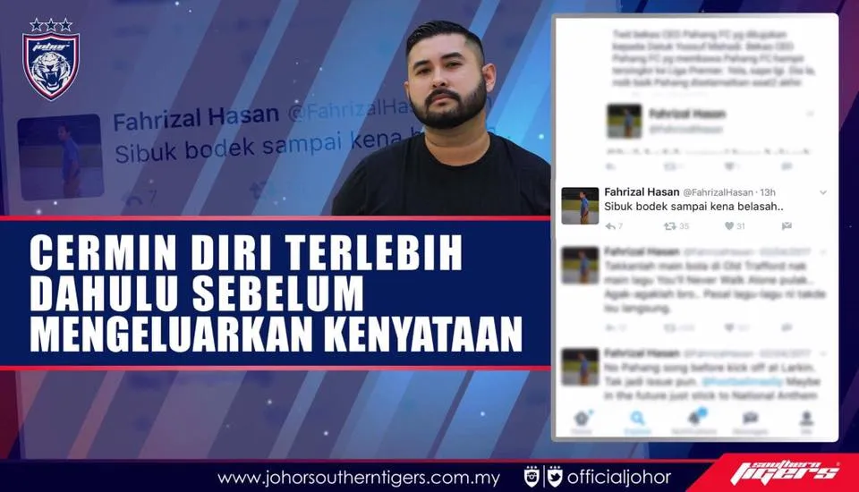 Newly-appointed FAM president Tunku Ismail has publicly taken a swipe at ex-Pahang FC CEO, Fahrizal Hassan over a controversial tweet that was posted in the aftermatch of Johor DT’s 7-0 triumph over Melaka United.