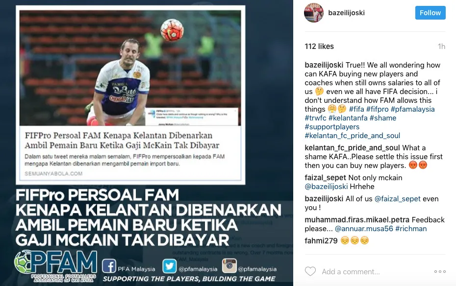 With FIFPro jumping on the bandwagon by posting a tweet regarding the status of unpaid wages involving Kelantan FA and its former employees, Ilijoski also took to his Instagram account to vent his frustrations towards the club.