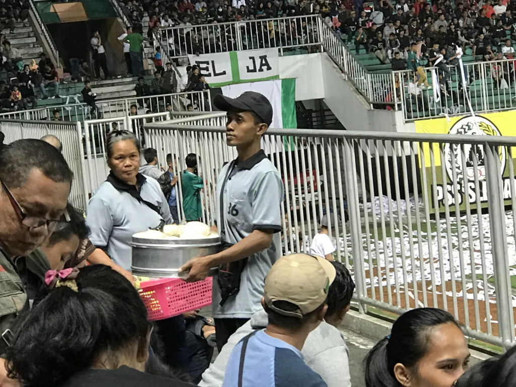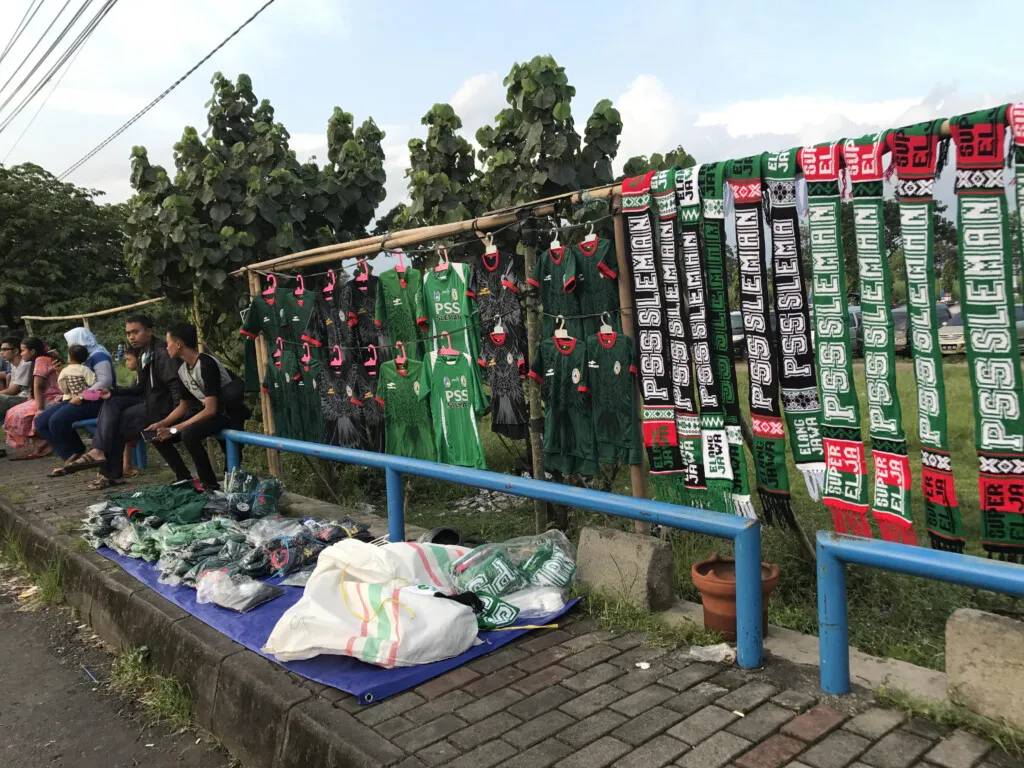 Di sekeliling stadium, banyak peniaga yang menjual mafla dan jersi tiruan sama seperti di Malaysia. Agak mengecewakan kerana tiada kedai rasmi yang menjual jersi original di stadium. Jersi original hanya dijual di kedai Sembada Apparel, pembuat jersi PSS Sleman. Tapi di stadium bezanya adalah dari segi makanan. Di Malaysia, kita sudah biasa dengan burger daging tanpa sayur, hotdog, nugget dan bebola goreng. Di Indonesia pula ramai peniaga bakso, bakpau dan masakan Indonesia yang lain.