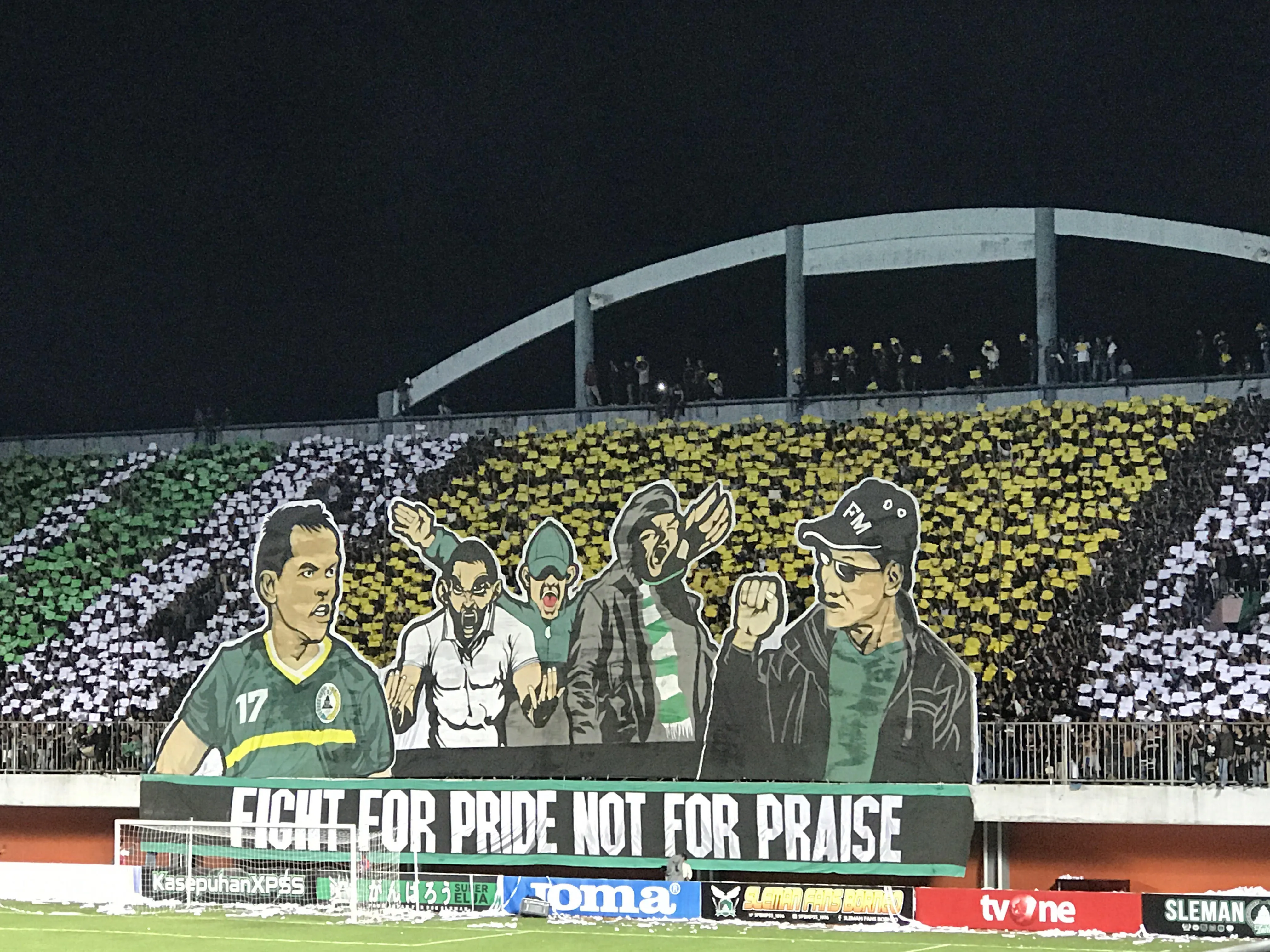 BCS mengangkat tifo yang menunjukkan gambar pemain, jurulatih dan penyokong PSS Sleman. Di Tifo tersebut tertulis “Fight for Pride not for Praise” (Berjuang untuk kebanggaan bukan untuk pujian). Tifo tersebut disambut dengan sorakan penyokong lain di dalam stadium.