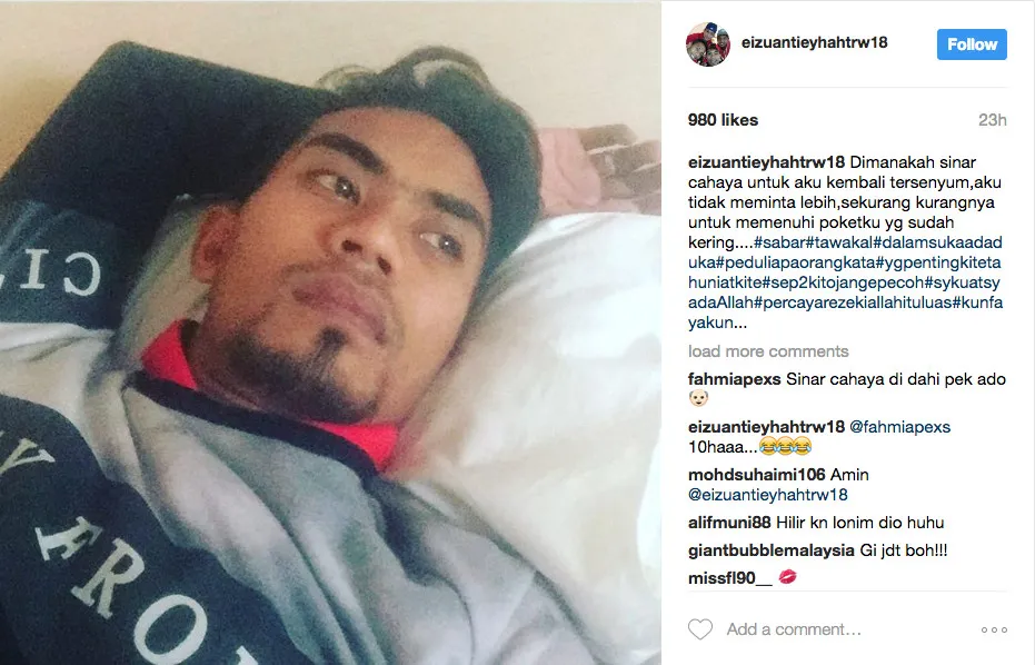 Khairul Izuan menyiarkan gambar dengan ayat: “Di manakah sinar cahaya untuk aku kembali tersenyum, aku tidak meminta lebih, sekurang-kurangnya untuk memenuhi poketku yang sudah kering..”