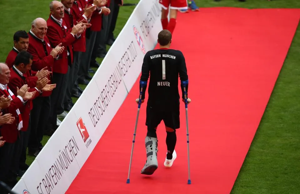 Goalkeeper Manuel Neuer joined in the fun as well, albeit in his crutches.