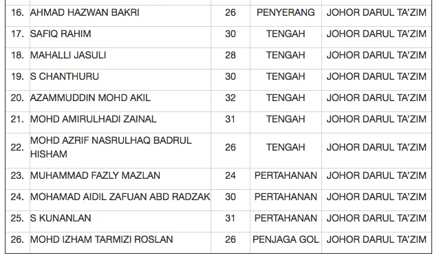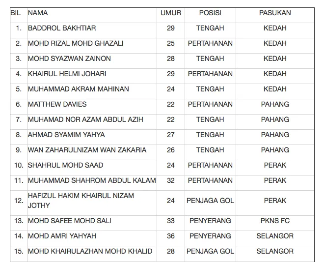 The squad features five players from Kedah, four players from Pahang, three players from Perak, one from PKNS FC, two from Selangor, and a whopping total of 11 players from Johor Darul Ta’zim.