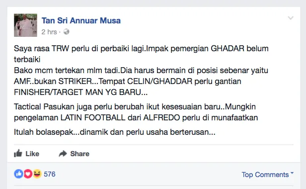 “The Red Warriors need to improve a lot. Ghaddar’s position has not been filled.” Tan Sri Annuar Musa vented via a statement on Facebook.