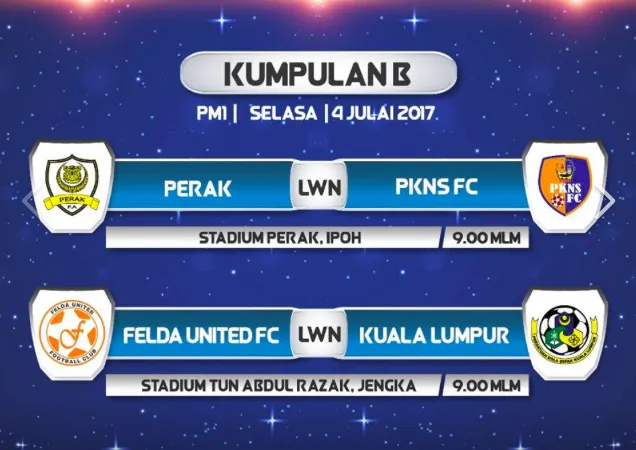 In the group B fixture, Perak will be going up against PKNS FC at the Stadium Perak Ipoh, while Felda United FC will face Kuala Lumpur at the Stadium Tun Abdul Razak.