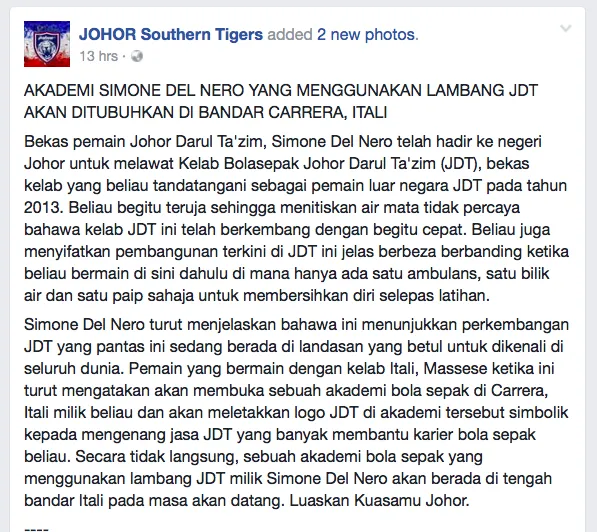 JDT’s former import player Simone Del Nero has announced plans to build his own football academy in Carrara, a city in central Italy.