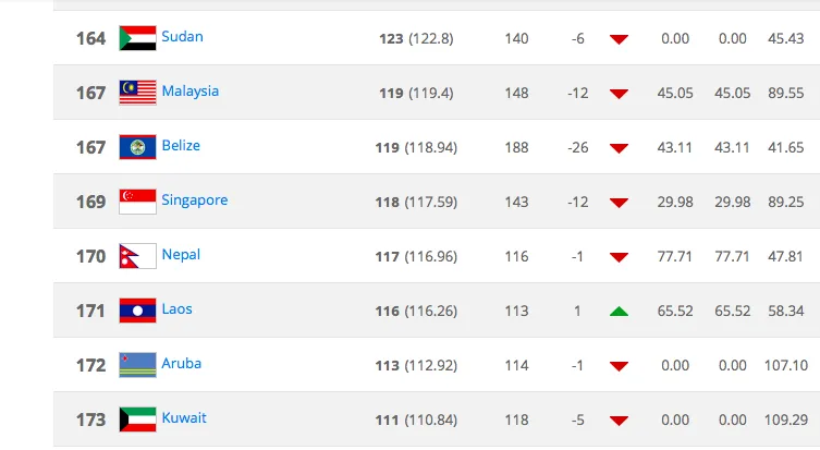 Malaysia has dropped 12 spots to 167th this month, compared to 155th place last month.
