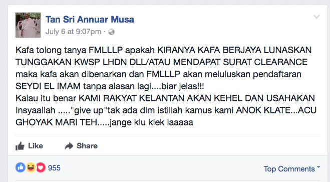In a series of Facebook postings, Tan Sri Annuar Musa explained that Kelantan FA (KAFA) have settled all their outstanding payments in terms of insurance and the Employee’s Provident Fund (EPF), and have obtained a letter of clearance.
