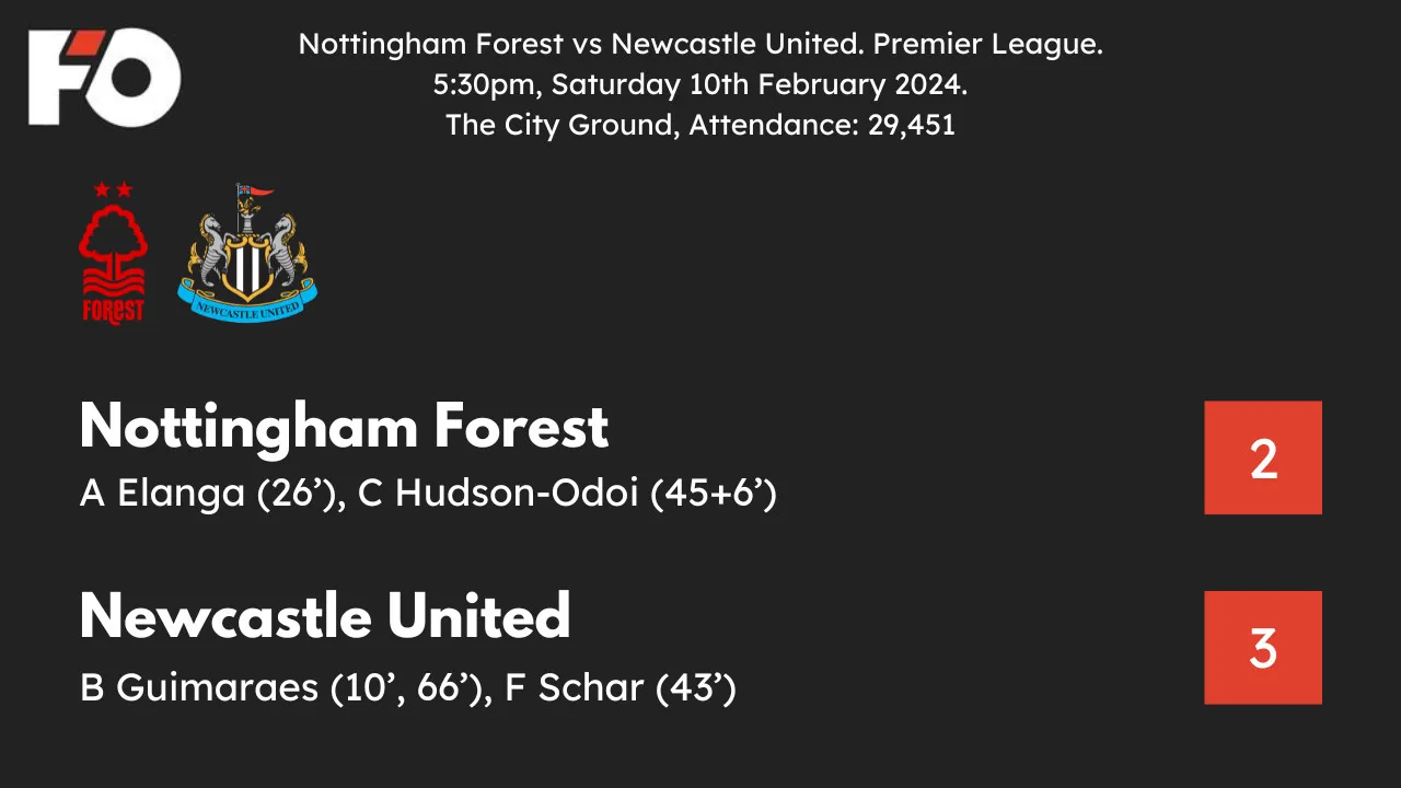 On Saturday Night Football, Newcastle defeated a determined Nottingham Forest team 3-2 in an exciting match.