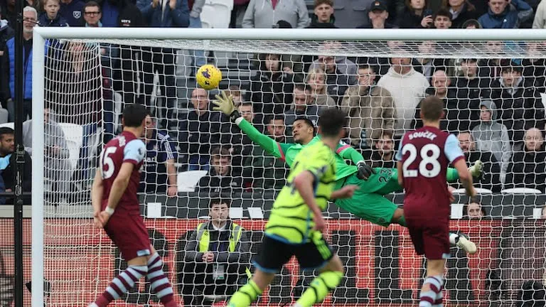 Arsenal defeated West Ham 6-0 at the London Stadium thanks to a long-range goal by Declan Rice, which sealed an incredible victory that kept Arsenal two points behind champions Liverpool.