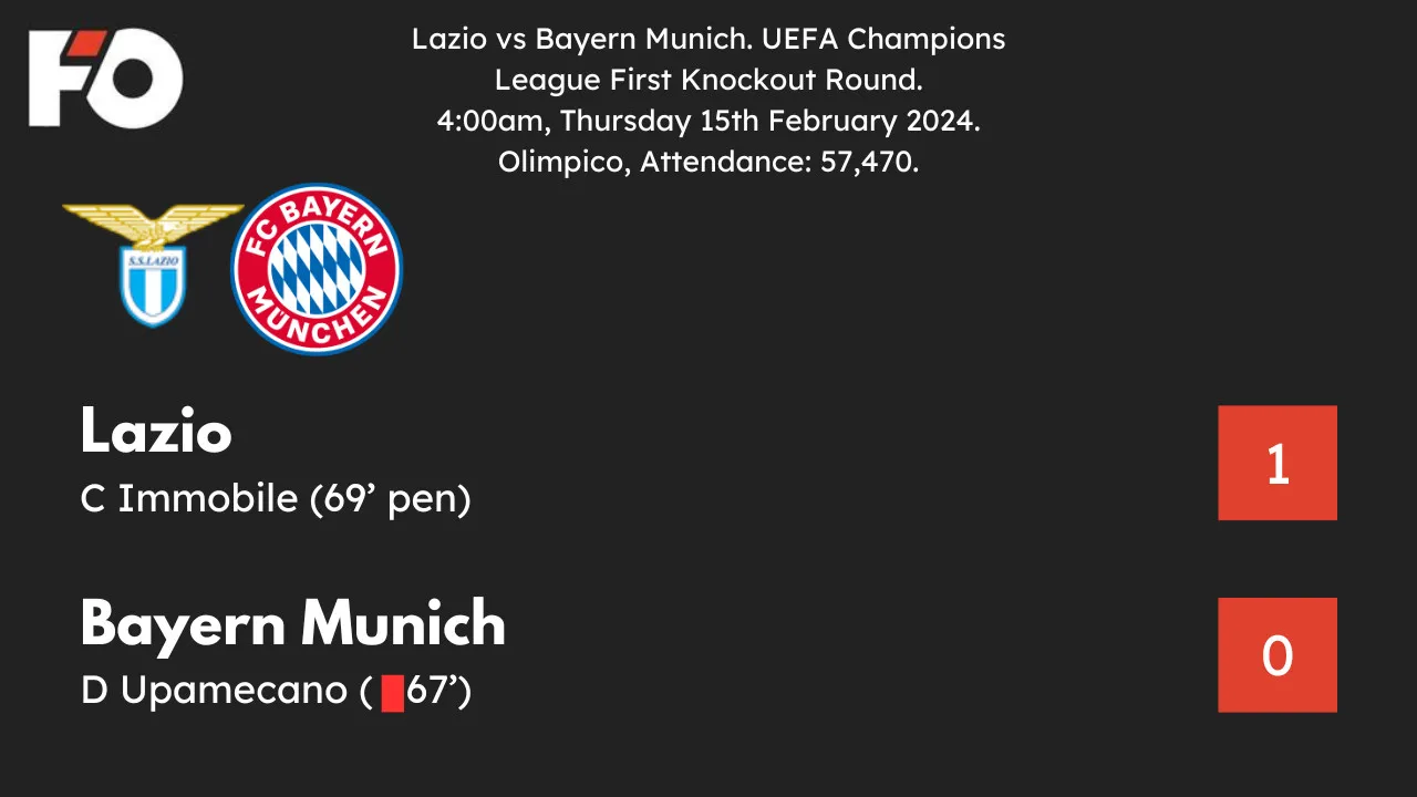 Lazio won 1-0 in the first leg of their last-16 match thanks to a penalty kick from Ciro Immobile, Bayern Munich still has work to do if they hope to advance to the Champions League quarterfinals.