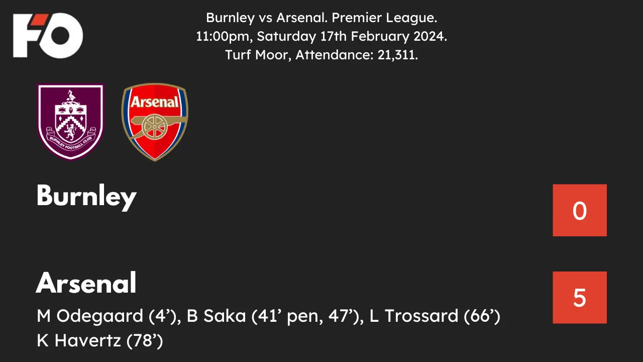 Arsenal defeated lowly Burnley 5-0 thanks to a bravura performance from Bukayo Saka, and the Gunners once more reduced the gap between themselves and Premier League leaders Liverpool to two points.