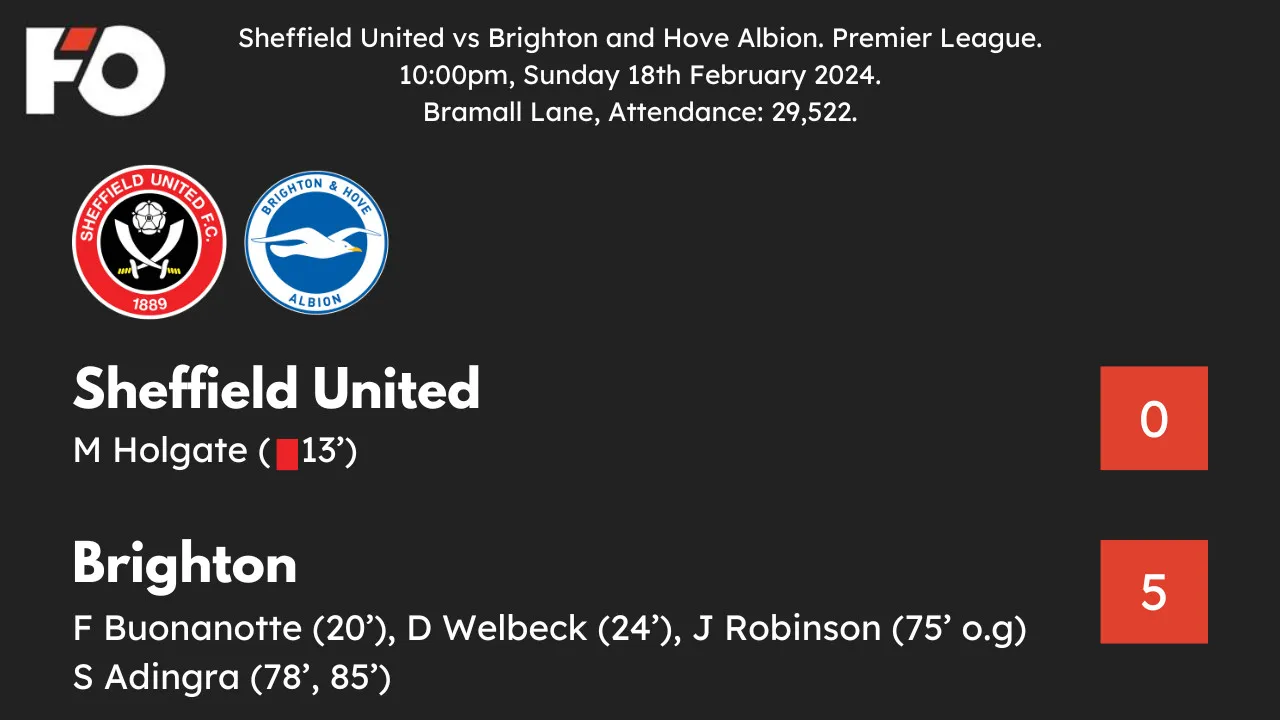 Brighton easily won 5-0 at Bramall Lane after Sheffield United defender Mason Holgate was sent off in the 13th minute for a horrific tackle.