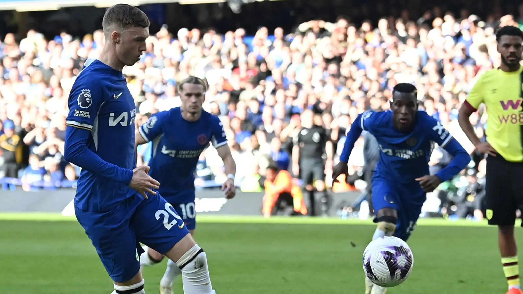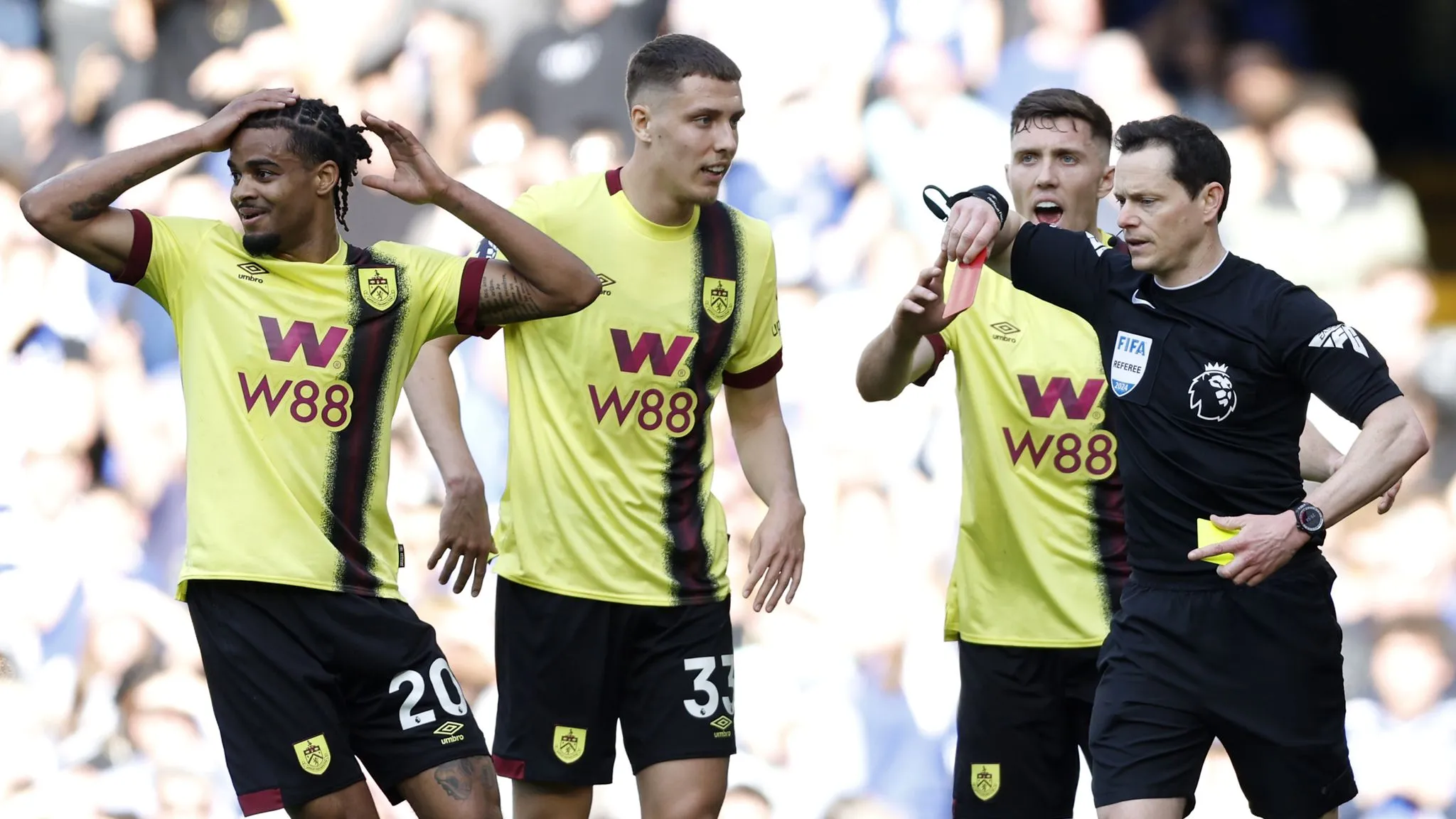 Following his initial booking of Assignon for a previous foul on Mudryk, referee Darren England signalled the spot and then gave the player a second yellow card. On the touchline, Clarets manager Vincent Kompany became enraged about the whole incident, and he was subsequently escorted indoors. After that, Cole Palmer scored a Panenka to coolly finish the ensuing penalty.